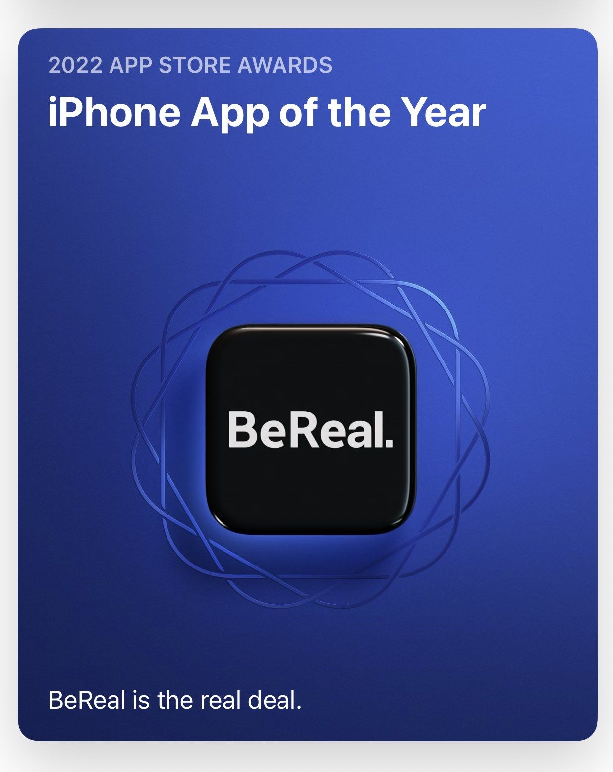 BeReal recibió el premio 'Elección de los usuarios' como mejor app del año 2022 de parte de Google Play Store y fue nombrada aplicación del año 2022 por Apple. “El fenómeno cultural BeReal transformó nuestros momentos más mundanos en una conexión significativa”, comentaron los editores del AppStore.