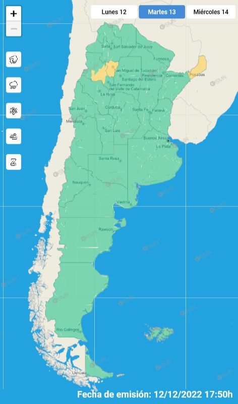 Según el SMN, la alerta meteorológica amarilla por fuertes tormentas con ocasional caída de granizo e intensa actividad eléctrica rige para las provincias de Misiones, Catamarca y Tucumán.