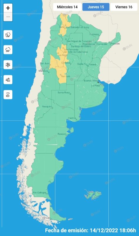 Para este jueves 15 de diciembre, el Servicio Meteorológico Nacional (SNM), en su Sistema de Alertas Meteorológicas Tempranas (SAT), pronostica fuertes tormentas acompañadas de ráfagas de viento e intensa actividad eléctrica que afectarán dos provincias del norte mientras que otras cinco se encuentran bajo alerta por fuertes ráfagas de viento.