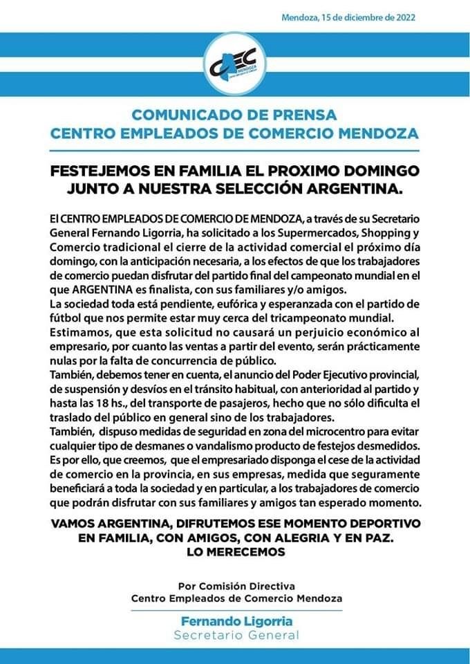 Mientras la Cámara Empresaria de Comercio, Industria, Turismo y Servicio de la ciudad (Cecitys), anunció en las últimas horas actividad normal de sus empresas adheridas en la previa, durante y post final del Mundial de Qatar, desde el Centro Empleados de Comercio (CEC) solicitaron el cese de la atención el domingo en supermercados, shopping y locales en general, para que los trabajadores puedan disfrutar del partido entre Argentina y Francia.