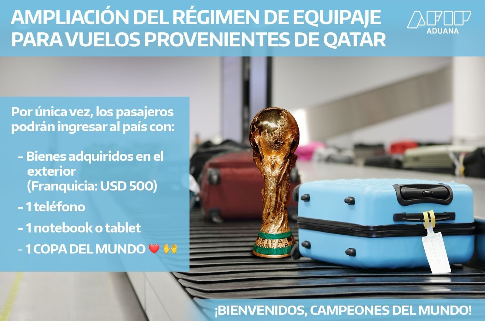 El organismo precisó que, por única vez, cada pasajero que arribe al aeropuerto de Ezeiza podrá ingresar al país con bienes adquiridos en el exterior con una franquicia de u$s 500, 1 teléfono celular y una tablet o notebook. Y, como excepción, ¡1 COPA DEL MUNDO!