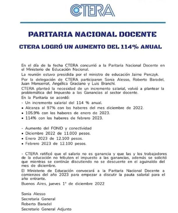 Según indicó el sindicato docente a través de un comunicado, se acordó un incremento salarial paulatino de 97% en diciembre del 2022, 105,9 % en enero del 2023 y finalizaría en febrero del 2023, con un total de aumento del 114%.