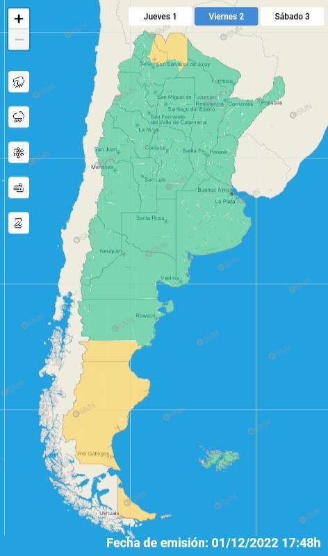 Según el SMN, la alerta meteorológica amarilla por fuertes tormentas con ocasional caída de granizo e intensa actividad eléctrica rige para las provincias de Jujuy y Salta mientras que Tierra del Fuego, Chubut y Santa Cruz tienen alerta amarilla por fuertes ráfagas de viento que podrían superar los 90 kilómetros por hora.