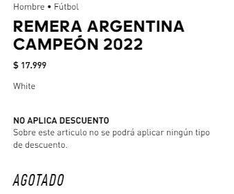 Luego de que Argentina se impusiera ante Francia en la tanda de penales y se consagrara campeona del mundo, la marca que viste a la Selección nacional lanzó la venta anticipada de la remera especial que cuenta con las tres estrellas y el logo con los colores celeste y blanco, la misma que los jugadores utilizaron para festejar durante el vuelo de regreso desde Qatar y la llegada a Buenos Aires. Rápidamente, en el sitio oficial colapsó y se agotaron las unidades que tenían un valor de 17.999 pesos.