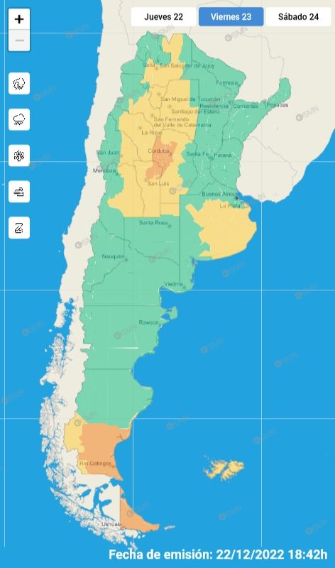 El Servicio Meteorológico Nacional (SMN) indica que este viernes se registrará descenso de la temperatura debido al ingreso de un frente frío y vientos moderados del sector sur. El sistema nacional emitió una alerta amarilla por tormentas con ocasional caída de granizo y fuertes vientos que afectarán una gran parte del territorio mendocino.
