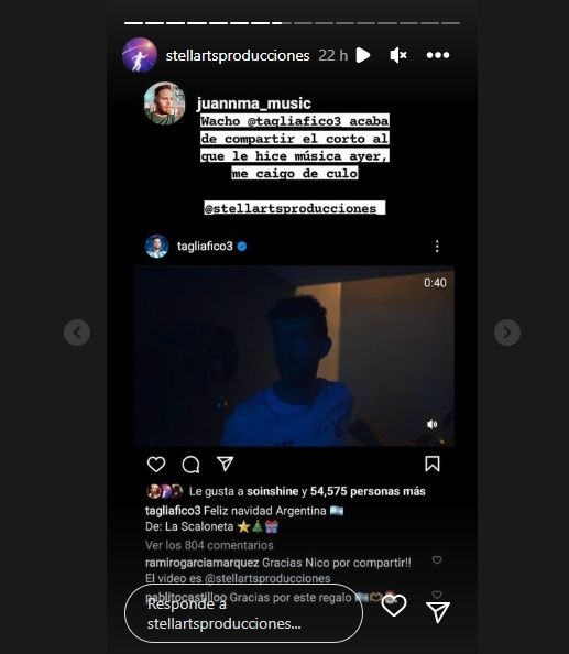 El impacto fue tal que desde la cuenta de Instagram de la agencia celebraron el posteo del exIndependiente de Avellaneda. Juan Almirón, quien hizo le puso el modo villancico navideño a la canción de la Selección, dijo en sus redes: "Wacho, Tagliafico acaba de compartir el corto al que le hice música ayer. Me caigo de culo. Ya llegó a 100 k (cien mil reproducciones), que locura".
