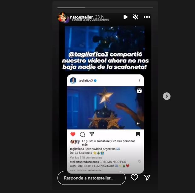 Antes de finalizar, el video muestra un texto con el comentario de: "El mejor regalo ya está en casa" y muestra la firma de la agencia local Stell Arts. El contenido se hizo viral de inmediato ya que Nicolás Tagliafico lo subió a sus redes y dijo: "Feliz Navidad Argentina. De: La Scaloneta". La publicación en el Instagram del futbolista superó las 120.000 reproducciones al instante.