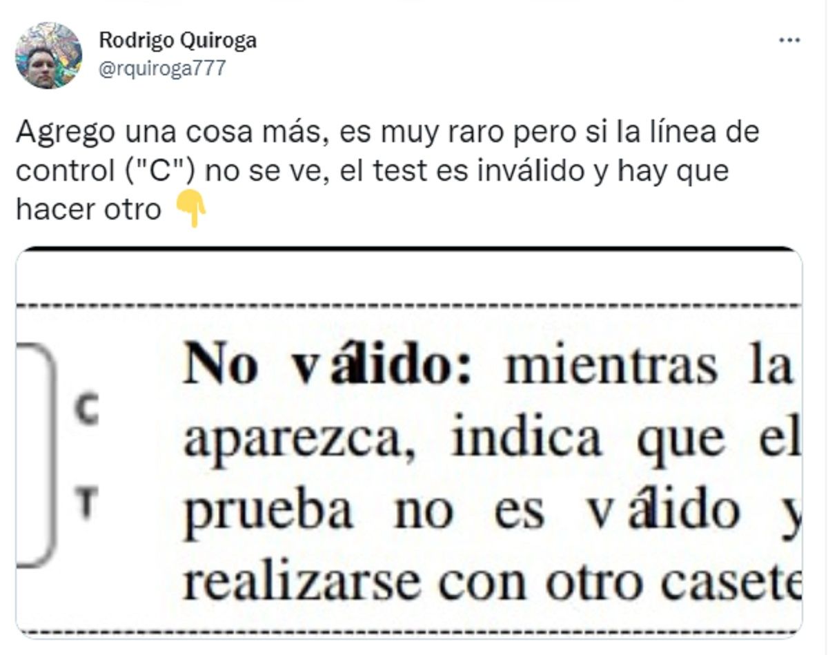 Una vez que se concreta la extracción de la muestra, el paso siguiente es introducir el hisopo en el tubo pequeño con líquido (buffer) y girarlo durante 60 segundos. "Si el tubito es blando, podés mojar el hisopo y escurrirlo con las paredes del tubo", aclaró el especialista y detalló que luego es necesario sacar el hisopo, tapar el tubo con el gotero, y echar tres gotitas en el agujero. "El líquido debe subir por capilaridad y se debe ir mojando de a poco la tirita reactiva", añadió y recomendó luego de estos pasos, esperar unos cinco minutos. "Si aparece una sola banda, es negativo. Si aparecen dos bandas, por más tenue que sea, es positivo", detalló Quiroga y aclaró que si la línea de control no se ve, entonces el test no es válido y es necesario efectuar otro.