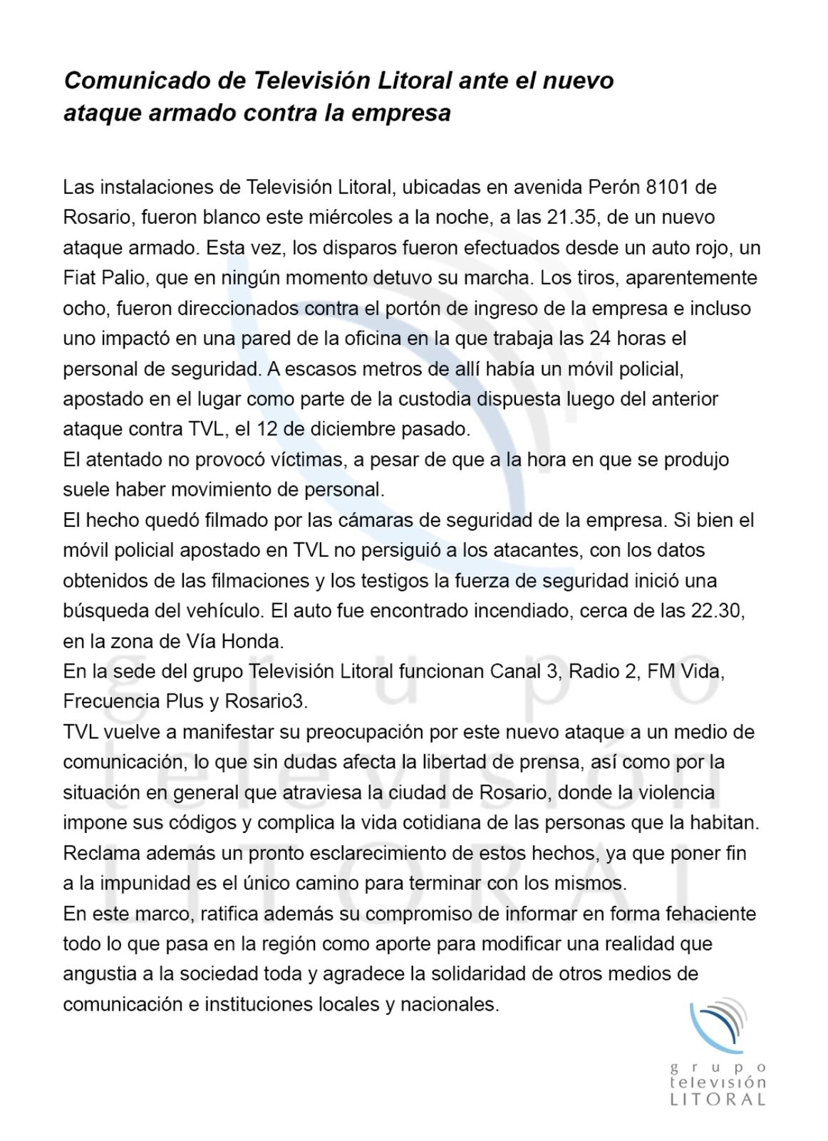 En el multimedios Televisión Litoral funcionan Canal 3, Radio 2, FM Vida, Frecuencia Plus y Rosario3. La empresa sacó un duro comunicado repudiando los ataques. “TVL vuelve a manifestar su preocupación por este nuevo ataque a un medio de comunicación, lo que sin dudas afecta la libertad de prensa, así como por la situación en general que atraviesa la ciudad de Rosario, donde la violencia impone sus códigos y complica la vida cotidiana de las personas que la habitantes”, dice el documento. Además, las organizaciones ADEPA y el Sindicato de Prensa también repudiaron la seguidilla de ataques.