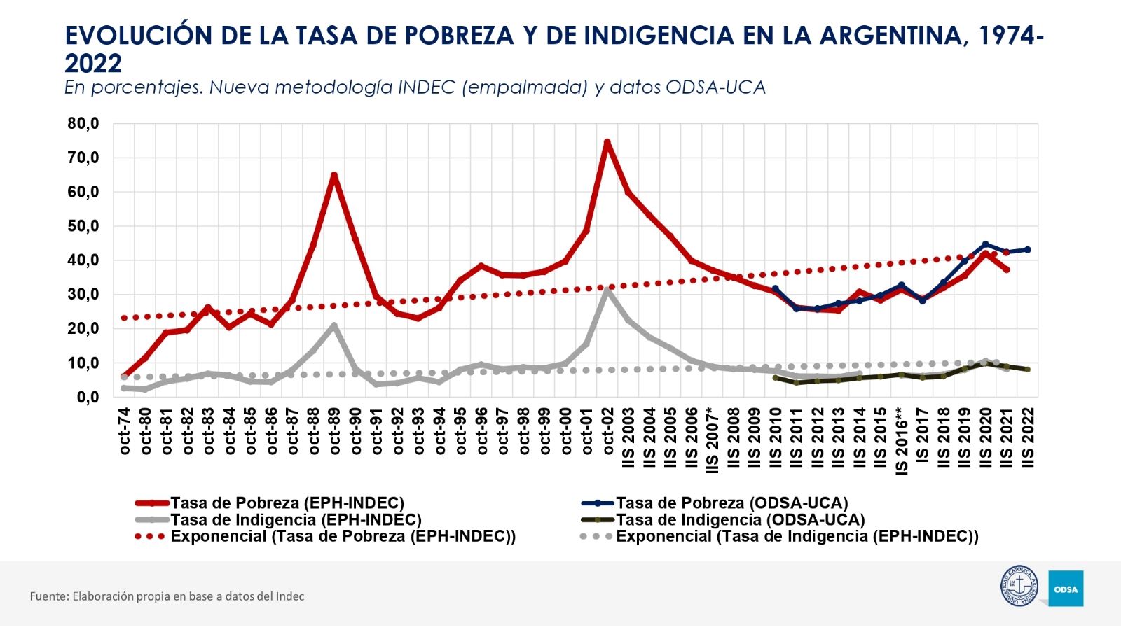 La decadencia monetaria es un punto impactante que brinda el ODSA de la UCA. Éste señala el siguiente crecimiento en la pobreza argentina: 6% en 1974, 20% en 1983, 25/30% en 1991 y 40% en la actualidad. Se trata de 17 millones de personas afectadas bajo las privaciones económicas fundamentales.