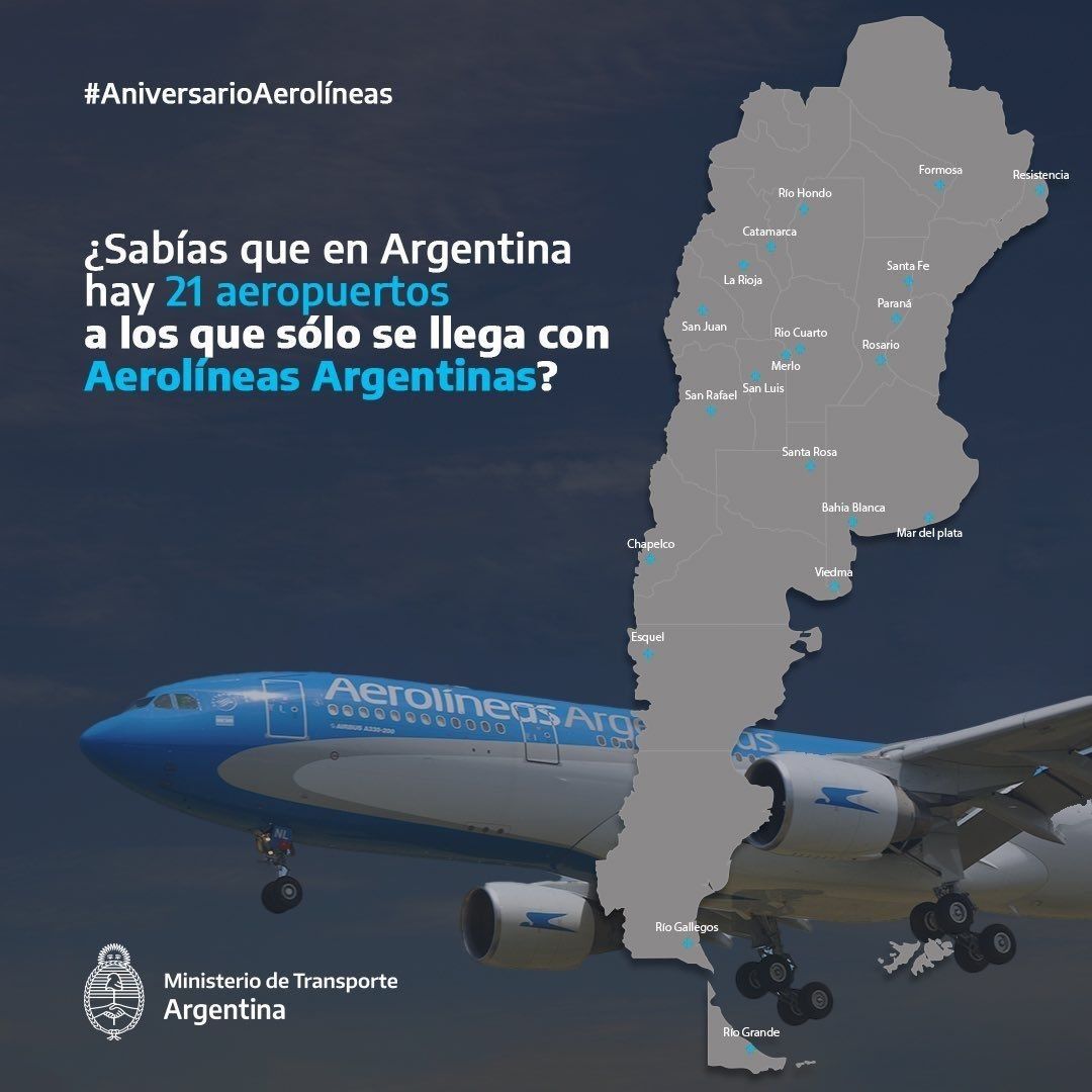 Como parte de un nuevo aniversario, Aerolíneas publicó: "¿Sabías que en Argentina hay 21 aeropuertos a los que sólo se llega con Aerolíneas Argentinas?".