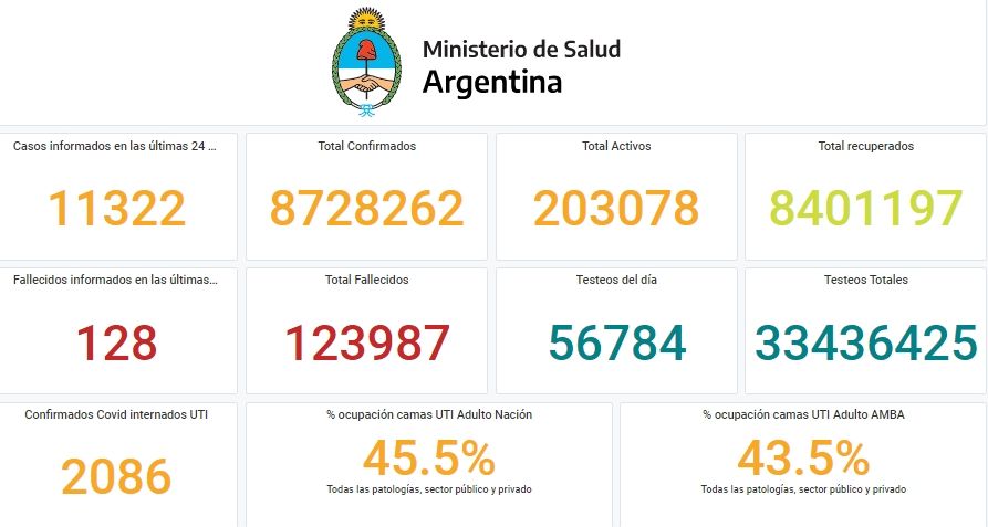 El Ministerio de Salud de la Nación informó este sábado 11.322 nuevos casos positivos de coronavirus y 128 fallecidos. Con estos datos, el total de contagios asciende a 8.728.262 y las víctimas fatales ya son 123.987.