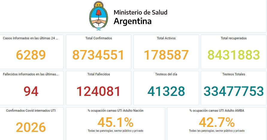 Además, informaron que en las últimas 24 horas se realizaron 41.328 testeos y que son 2.026 los internados en camas de UTI de todo el país.
