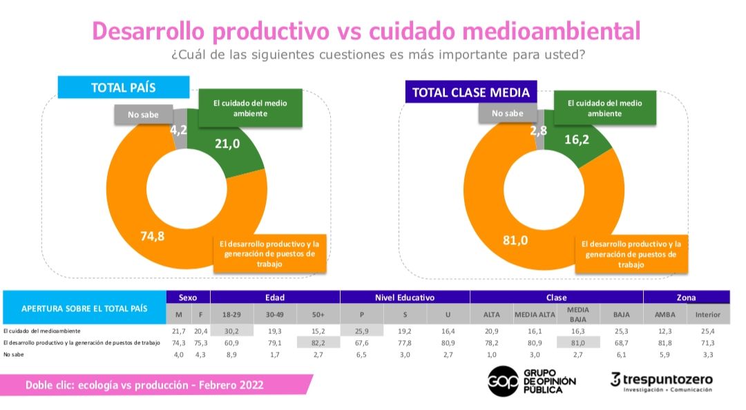 Cuidar el medioambiente o favorecer el desarrollo económico es en principio una dicotomía falsa. Un razonamiento posible es que si no quedan recursos, no habrá mundo para ninguna actividad. Por eso es justo decir que lo óptimo sería que fueran de la mano. Ahora bien, la opinión pública a veces opera sobre objetivos a corto plazo y en ese sentido en una Argentina empobrecida, la promesa de más fuentes laborales resulta una prioridad total. Sin embargo, el medio ambiente va ganando lugar en la agenda y el 80% de los argentinos piensa que son problemas graves o muy graves.