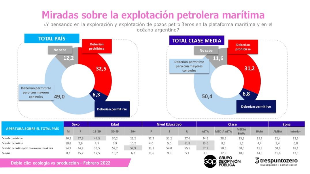 Hacia adentro de la consulta sobre miradas sobre la explotación petrolera marítima hay algunos matices. La explotación petrolera marítima pensando en pozos en el mar argentino, para un 32,5% deberían prohibirse, casi la mitad (49%) cree que se deberían permitir pero con mayores controles y un pequeño porcentaje de 6% está de acuerdo en que se avance en la situación que se está.