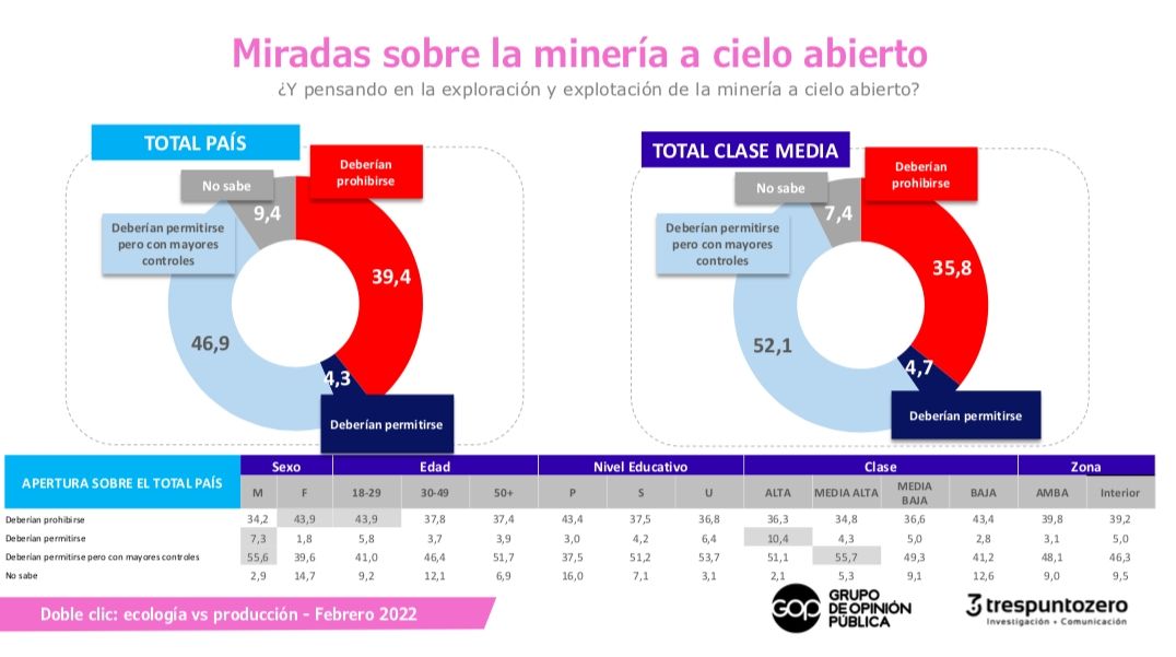 "Hay una inclinación política a pensar de que hay un fenómeno predatorio en el cual si hay una minera que extrae oro, luego se lo va a llevar a procesar y el día en que se vaya, aquí va a dejar sólo el pozo y el oro se fue", según explicó Timerman. Si bien un 46,9% cree que debería hacerse con mayores controles, quienes se oponen de manera taxativa asciende a 39,4%.