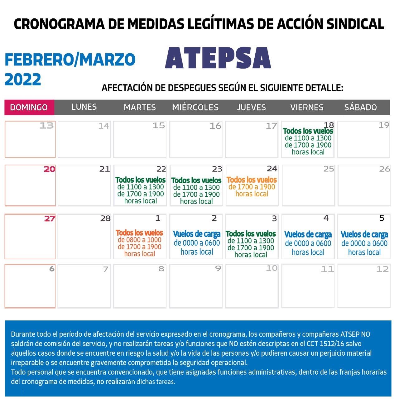 Las medidas gremiales de ATEPSA fueron apoyadas por la Asociación de Pilotos de Líneas Aéreas (APLA). Las mismas comienzan con un paro por el que se cancelarán todos los vuelos de 11 a 13 y de 17 a 19 este viernes 18 de febrero. El paro se repetirá el martes 22 y el miércoles 23 de febrero y el jueves 3 de marzo. Además, incluye paros en vuelos de carga los días miércoles 2, viernes 4 y sábado 5 de marzo.