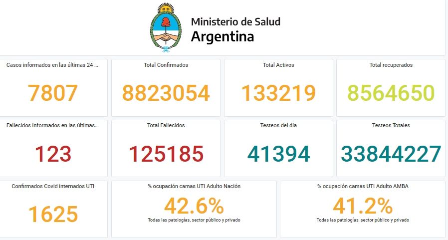 El Ministerio de Salud de la Nación informó este sábado 7.807 nuevos casos positivos de coronavirus y 123 fallecidos en las últimas 24 horas. Con estos datos, el total de contagios asciende a 8.823.054 y las víctimas fatales ya son 125.185.