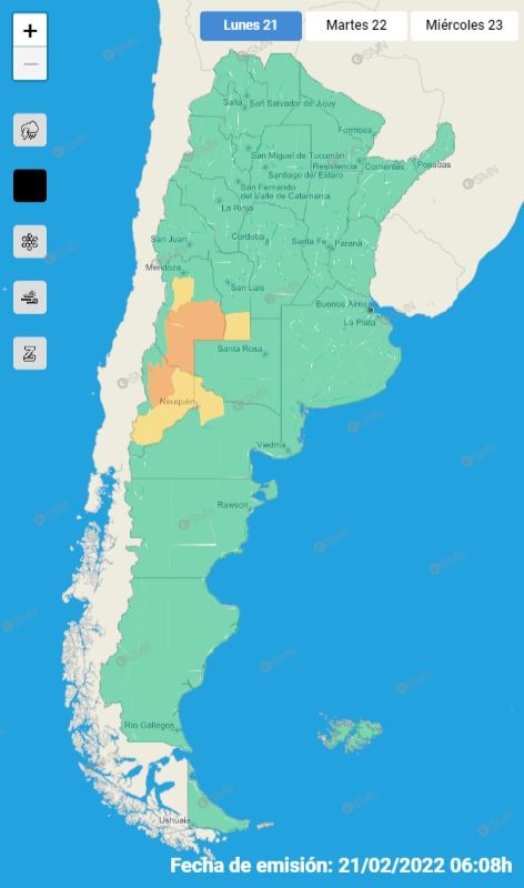 El Servicio Meteorológico Nacional pronostica, en su Sistema de Alertas Meteorológicas Tempranas, fuertes tormentas para gran parte del país, afectando a 12 provincias de Argentina. Además, se ha lanzado alerta naranja por intensas lluvias en dos provincias de Cuyo para este lunes 21 de febrero.