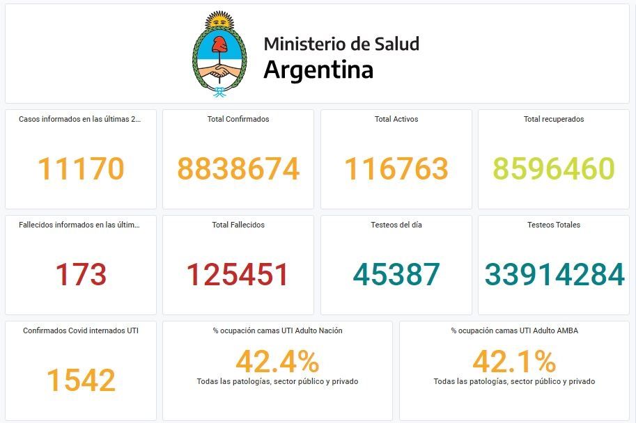 Argentina notificó este lunes 11.170 nuevos casos de coronavirus en las últimas 24 horas, de acuerdo a la información brindada por el Ministerio de Salud de la Nación.