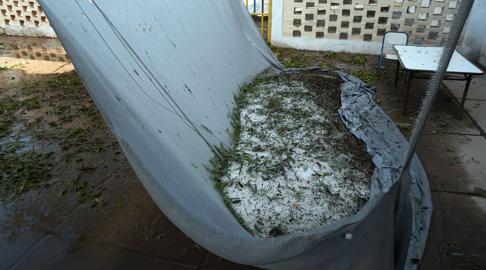 En esta escuela la media sombra del patio quedó con daños irreparables con agujeros y una parte se cayó. El granizo en esta zona tenía el tamaño de una pelota de golf y aún hay montículos de hielo acumulados en la tela.