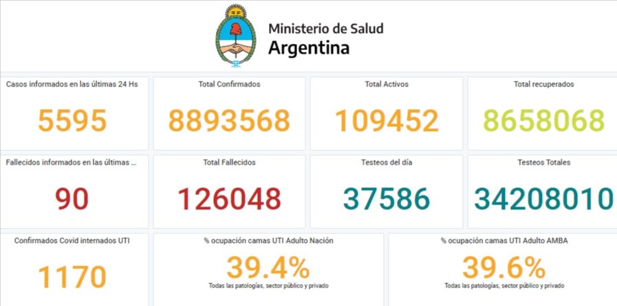 El Ministerio de Salud de la Nación informó este sábado 26 de febrero que, en las últimas 24 horas, se registraron 90 muertes por coronavirus y 5.595 nuevos contagios. Con estos datos, ya son 8.893.568 los casos acumulados desde el inicio de la pandemia, mientras que los fallecimientos suman 126.048.