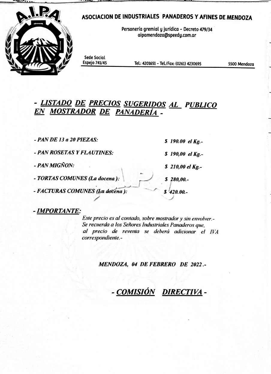 La Asociación de Industriales Panaderos y Afines de Mendoza informó que, a partir de este viernes 4 de febrero, se producirá un aumento en el precio del pan de entre el 10 % y el 12 %. Los motivos centrales de esta suba tienen que ver con un incremento en el precio de todas las materias primas que se utilizan en la elaboración de panificados y de los incrementos salariales para el personal.
