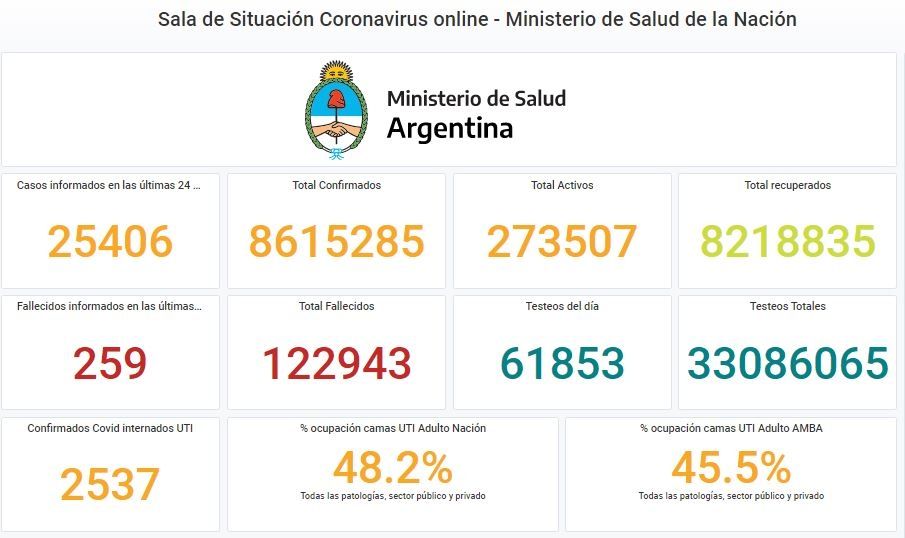 El Ministerio de Salud de la Nación informó este lunes 25.406 nuevos casos positivos de coronavirus y 259 fallecidos. Con estos datos, el total de contagios asciende a 8.615.285 y las víctimas fatales ya son 122.943.