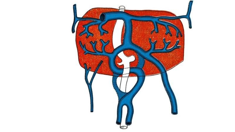 Antigua ilustración grabada del desarrollo de la circulación portal del embrión humano de aproximadamente tres semanas y media