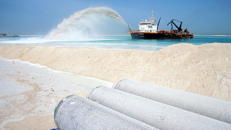 Un barco en el golfo Pérsico bombeando toneladas de sedimentos para formar gradualmente una isla.