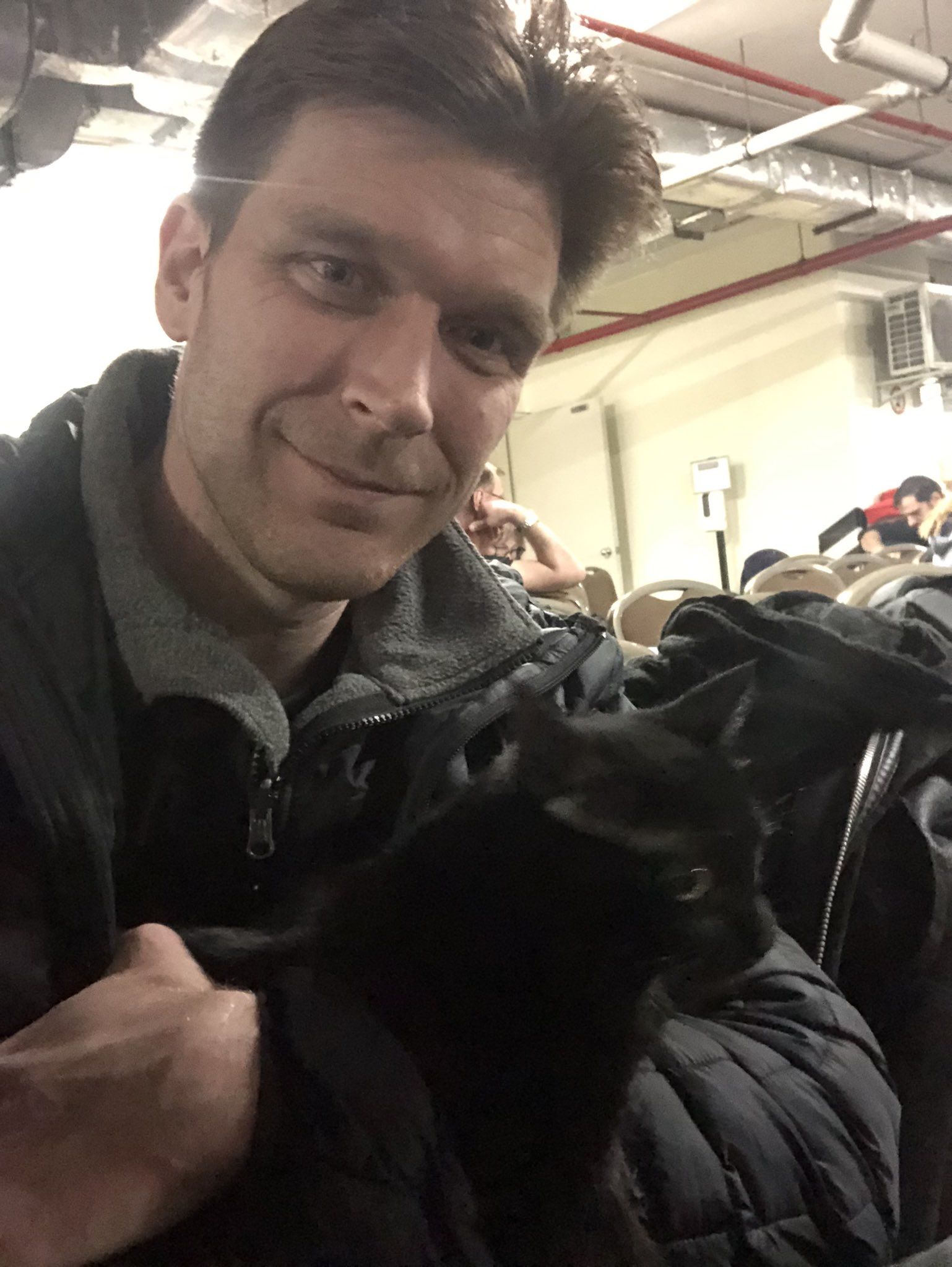 El reportero Nolan Peterson también mostró una imagen de su gato: "En el refugio antibombas con mi gato. Ha sido muy valiente", señaló.