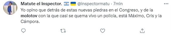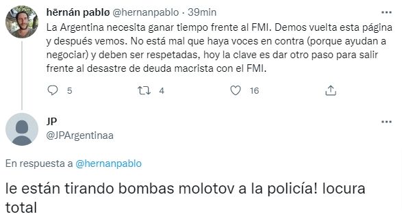 Mientras tanto alguien más comenta sobre el tema suponiendo que muchos de los manifestantes no conocen la verdadera razón por la que se movilizan. "¿Cuánto sabrán de lo que se debate en el congreso los que tiran molotov y piedras, no?".