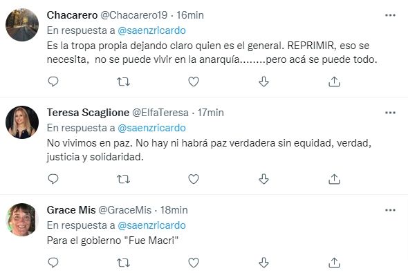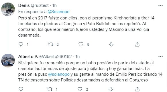 Un usuario le responde a Solano de manera tajante, en relación a las manifestaciones que están ocurriendo fuera del Congreso: "Típico de zurdo, tirar la molotov y esconder la mano". Otra usuaria se pregunta "¿Reprimen? o sea que hay que dejarlos que rompan todo????", a lo que otro usuario le responde "Armadísimo por ellos mismos. Quieren equiparar las 14 toneladas de piedras que le tiraron al gobierno anterior".
