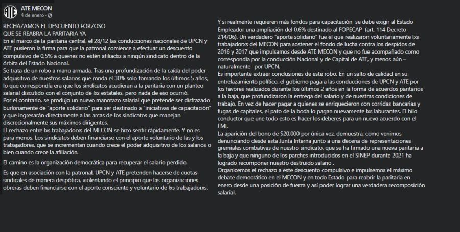Esta sorpresa -indignación, en muchos casos- se da principalmente por parte de aquellos que no hacen aportes sindicales, ya que recientemente deben aportar el porcentaje antes mencionado para "iniciativas de capacitación, formación y fortalecimiento de las acciones necesarias para que todas las mejoras y beneficios acordados en el Convenio Colectivo (CCTG 214/06) alcancen a todes les trabajadores sin excepciones". Esto se justificó en el comunicado publicado sitio convenios.ate.org.ar.