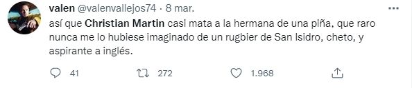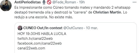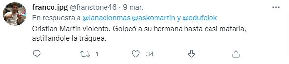 "Soy la hermana de Christian Martin. Quiero hablar sobre la mala persona que es y darte todo mi apoyo. Mi hermano fue preso en Londres por casi matarme. Estoy buscando dónde contar cómo es este hijo de pu... Hay tanto que la gente no sabe", indicó. Antes de darle un lugar en su programa, Cúneo invitó a Martin a un derecho a réplica: "Por lo que voy a contar ahora, tiene el derecho a réplica o el que calla, otorga".