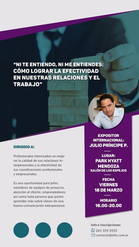 El próximo viernes 18 de marzo en el Hotel Hyatt se presenta en Mendoza el coach Julio Príncipe P, líder en capacitaciones para empresas y profesionales que quieran mejorar sus relaciones laborales y la efectividad en su empleo.