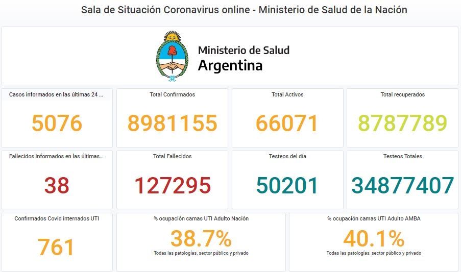 El Ministerio de Salud de la Nación informó este martes 5.076 nuevos contagios de coronavirus y 38 muertes. Con estos datos, el total de casos asciende a 8.981.155 y las víctimas fatales ya son 127.295.