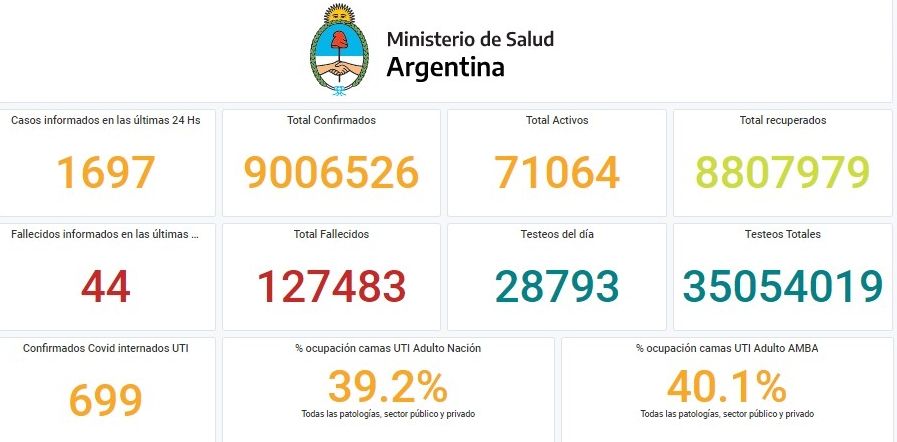 El Ministerio de Salud de la Nación informó este sábado que, en las últimas 24 horas, se registraron 44 muertes por coronavirus y 1.697 nuevos contagios en el país. El total de casos en el país desde el inicio de la pandemia es de 9.006.526, mientras que los fallecimientos suman 127.483.