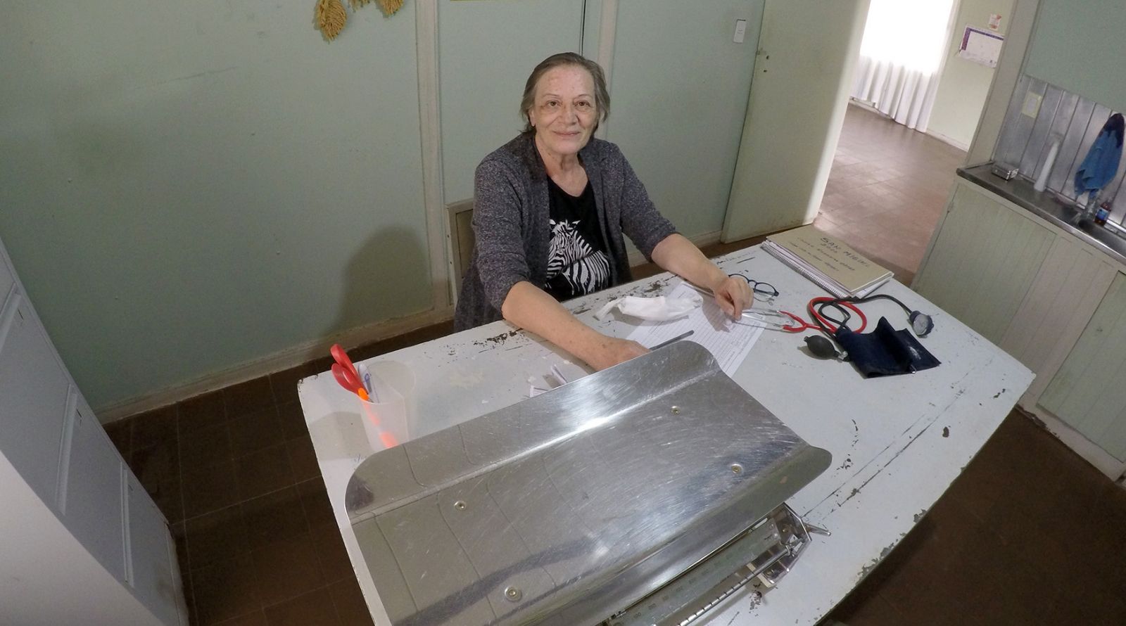 Llegó el momento de ingresar a la sala, antes nos recibe una inscripción en la puerta escrita con corrector de lapicera blanco, el mismo indica cuáles son los días y horarios de atención. Ingresamos hasta el consultorio y fue inevitable no tener una sensación de viaje en el tiempo, tanto el mobiliario como los elementos de trabajo son de varias décadas atrás. La doctora Stella nos invita a pasar.