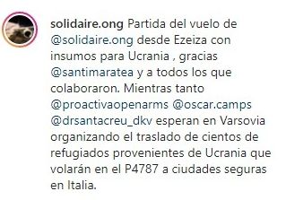 La organización Solidaire, dirigida por el médico, cineasta y piloto Enrique Piñeyro, junto con la ayuda de la Embajada de Ucrania y las donaciones que recaudó el influencer Santiago Maratea organizó un vuelo que partió el domingo a la madrugada con más de 10 toneladas de donaciones para los refugiados de la guerra en Ucrania, en su mayoría ancianos, mujeres y niños.