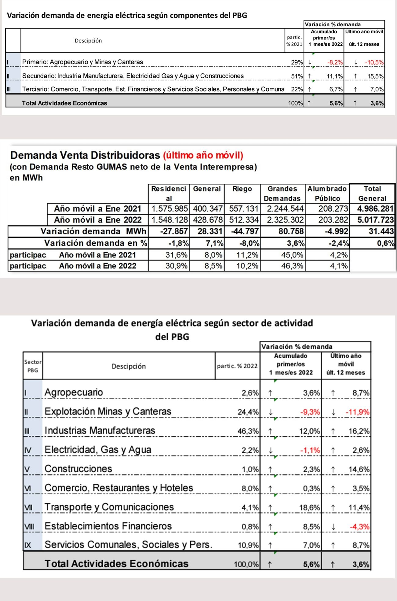 Si bien hubo bajas en actividades mencionadas, como la extracción de petróleo crudo y refinación de petróleo, entre otros, la contracara fue el aumento de la demanda eléctrica en los rubros industrias de hierro y acero, fabricación de productos plásticos, elaboración de cemento, elaboración de vino, elaboración de cervezas, elaboración de vidrios y sector conservero. Éstas actividades -según el EPRE- llevaron a la industria manufacturera a una variación positiva de 16% anual (a enero de 2022).