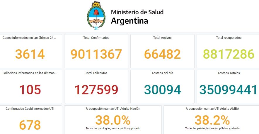El Ministerio de Salud de la Nación informó este lunes 3.614 nuevos casos positivos de coronavirus y 105 muertes. Con estos datos, el total de contagios asciende a 9.011.367 y las víctimas fatales ya son 127.599.