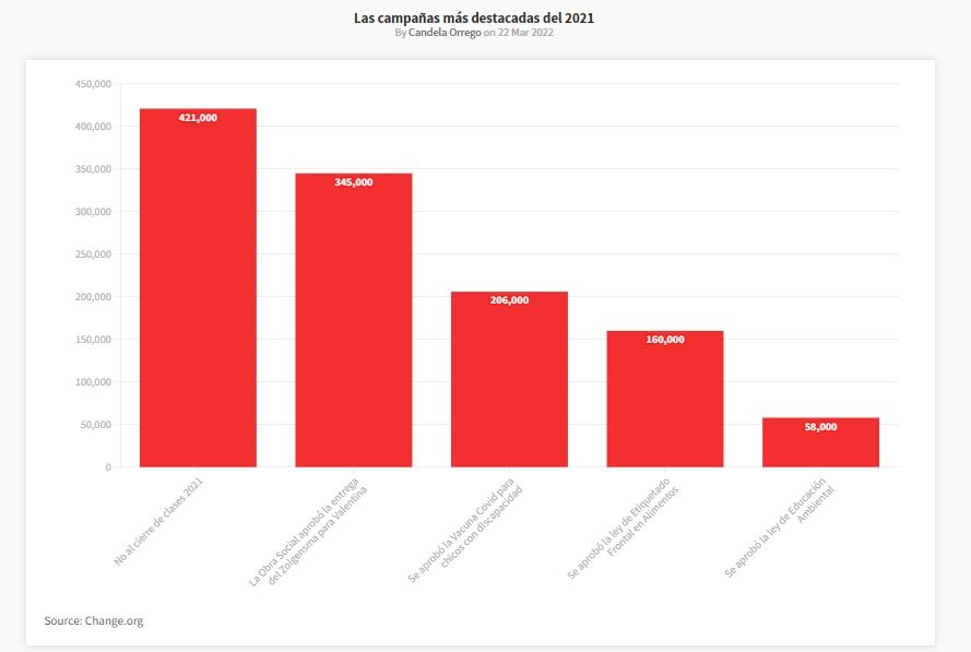 A nivel nacional, durante el 2021 se crearon 11 mil peticiones en Change.org Argentina. Esto equivale a más de 200 peticiones por semana y se traduce a unos 21 millones de firmas. Además, en ese mismo año la plataforma recibió casi 2 millones de usuarios nuevos, lo que atribuyen a la difusión de campañas mediante redes sociales y cadenas de WhatsApp. El 90% de los usuarios ingresan desde su celular a firmar peticiones, lo que coincide con un 60% de firmas que llegan desde WhatsApp y un 30% de firmas desde redes sociales.
