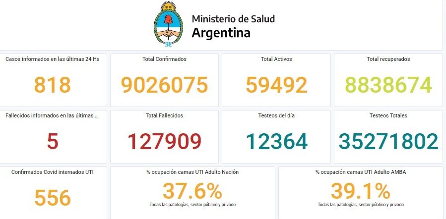 En cuanto a la cantidad de pacientes con coronavirus internados en unidades UTI, actualmente hay 556 en todo el país. El porcentaje de ocupación de camas UTI se ubica en 37,6% a nivel nacional y en 39,1% en el AMBA.