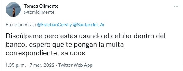 Mientras tanto, la cuenta oficial del Banco Santander Argentina le contestó a Esteban pidiendo disculpas por la molestia: