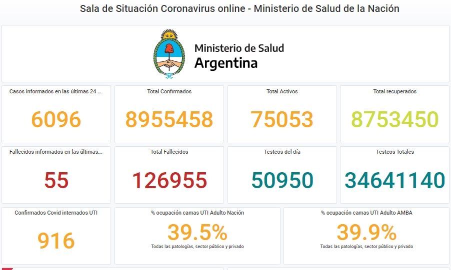 El Ministerio de Salud de la Nación informó este miércoles 6.096 nuevos casos positivos de coronavirus y 55 muertes. Con estos datos, el total de contagios asciende a 8.955.458 y las víctimas fatales ya son 126.955.