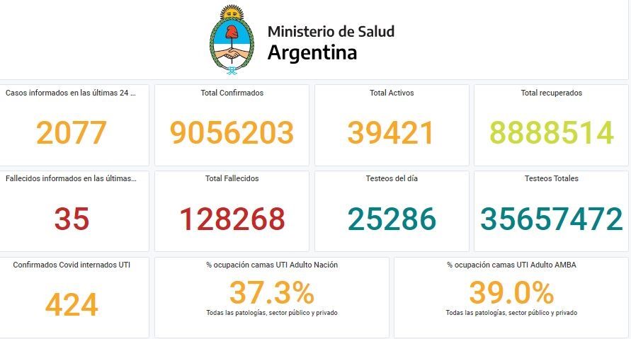 El Ministerio de Salud de la Nación informó 2.077 nuevos casos positivos de coronavirus y 35 muertes. Con estos datos, el total de contagios asciende a 9.056.203 y las víctimas fatales ya son 128.268.