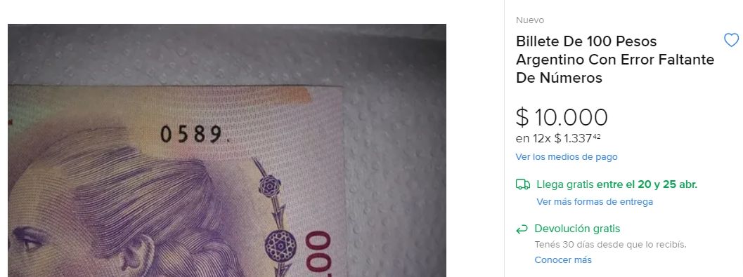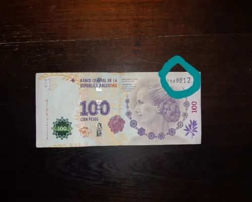 En este caso podemos ver un billete de $100 que se vende por $10.000 gracias a un error en la impresión de los números. Es por este error, que a simple vista puede parecer pequeño, que este billete multiplica por 100 su valor.