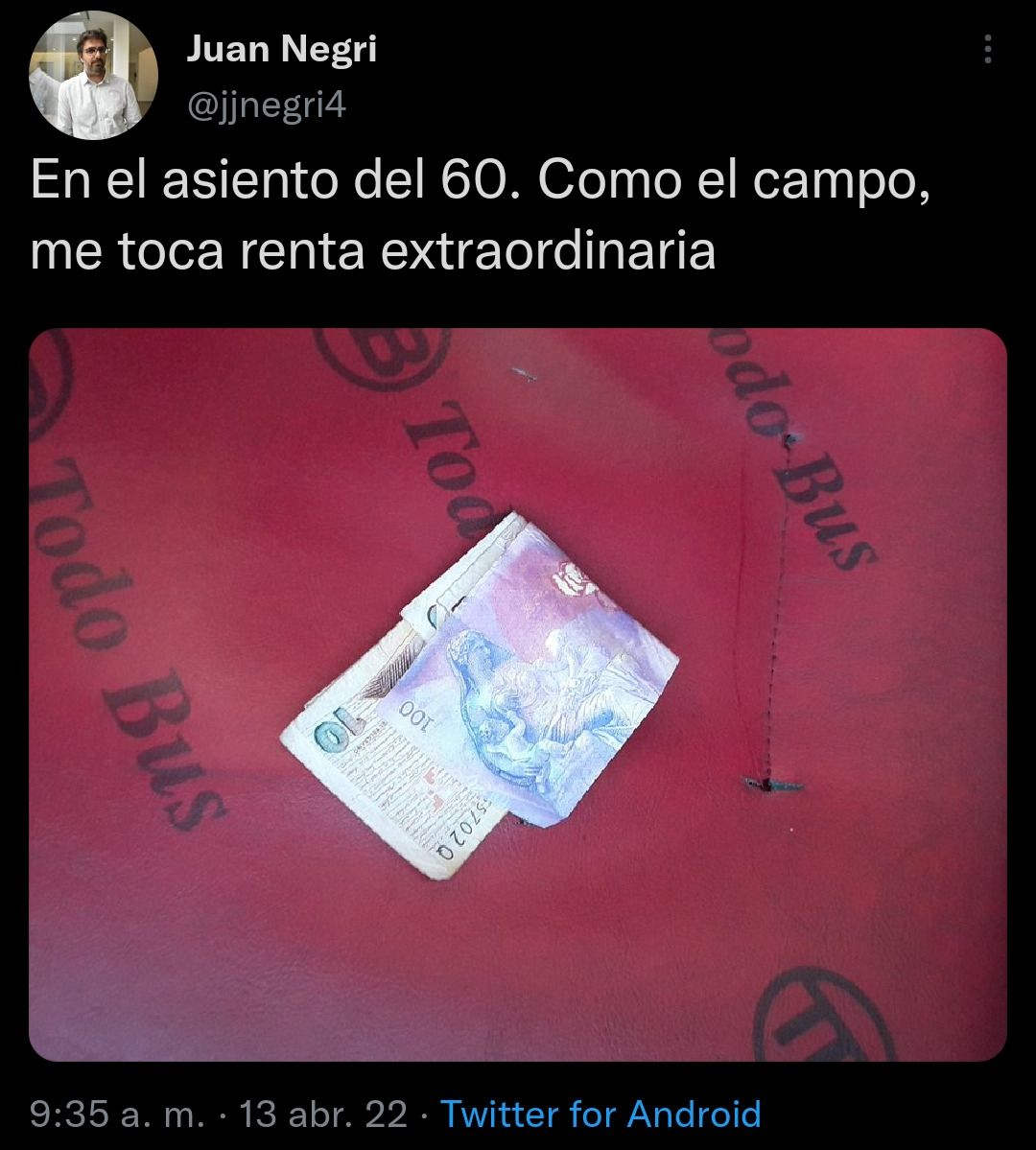 Otros eligieron el humor como descargo. Un ejemplo es el de una persona que comenta: "Me acabo de encontrar 100 pesos en la calle. Espero que el gobierno no me cobre el impuesto a la renta extraordinaria. Por las dudas igual me compro un caramelo". A raíz de esto, otro le responde: "Ojo, el caramelo tributa Bienes Personales". Un usuario más hace un chiste similar. Después de sacarle una foto a un billete en un asiento de un bondi, bromea: "En el asiento del 60. Como el campo, me toca renta extraordinaria".