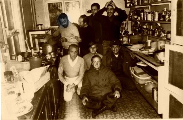El periodista -en el margen izquierdo- sacando a relucir sus dotes de cocinero. El lugar de residencia del equipo de Télam que cubrió el conflicto bélico lo abrieron como si fuera un «club privado» para que algunos de sus amigos pudieran tener un tiempo de esparcimiento en medio de tanto horror.